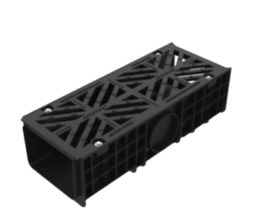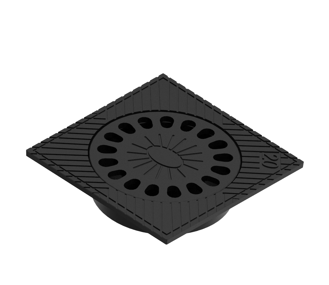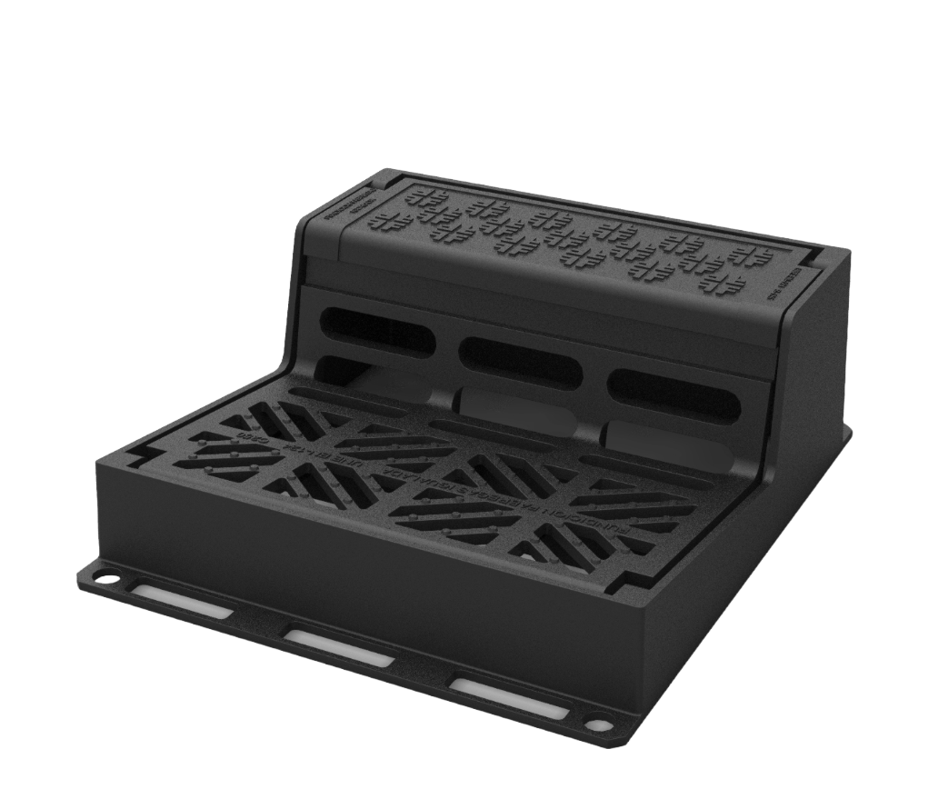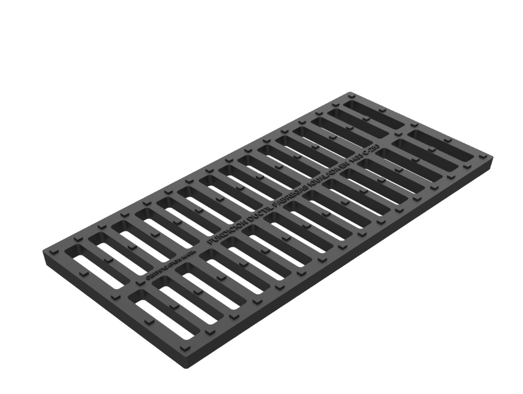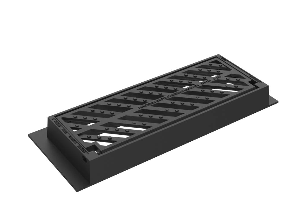 A grate with a channel to collect rainwater and direct it to the drainage pipe. Made of ductile iron.