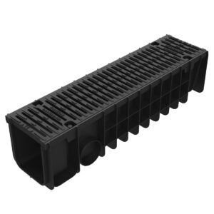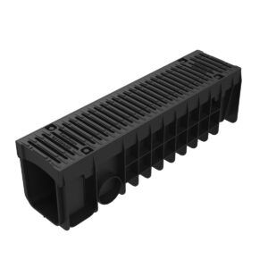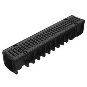 Conjunto de grelha e canal para recolher água da chuva e conduzi-la ao sistema de evacuação. Fabricado em material compósito.